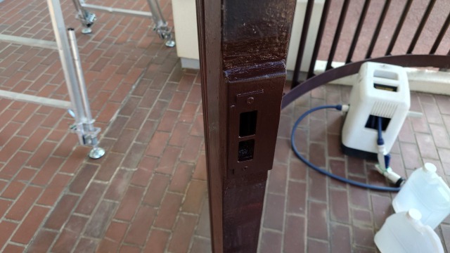 非常階段の扉の鍵が開けにくいとのことで、受け部分の取替を行いました。
