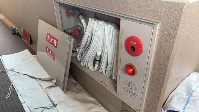 マンション廊下にある消火栓の扉が軸が腐って倒れてきてしまうので修理をしました。