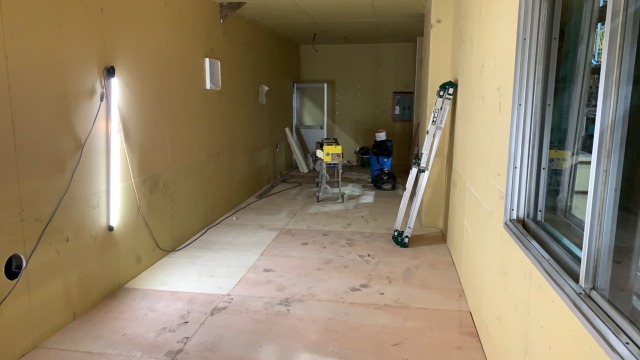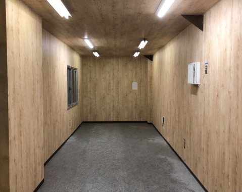 既設事務所の壁、天井解体後に床組み、ビニルクロス、ビニルタイルを行い、